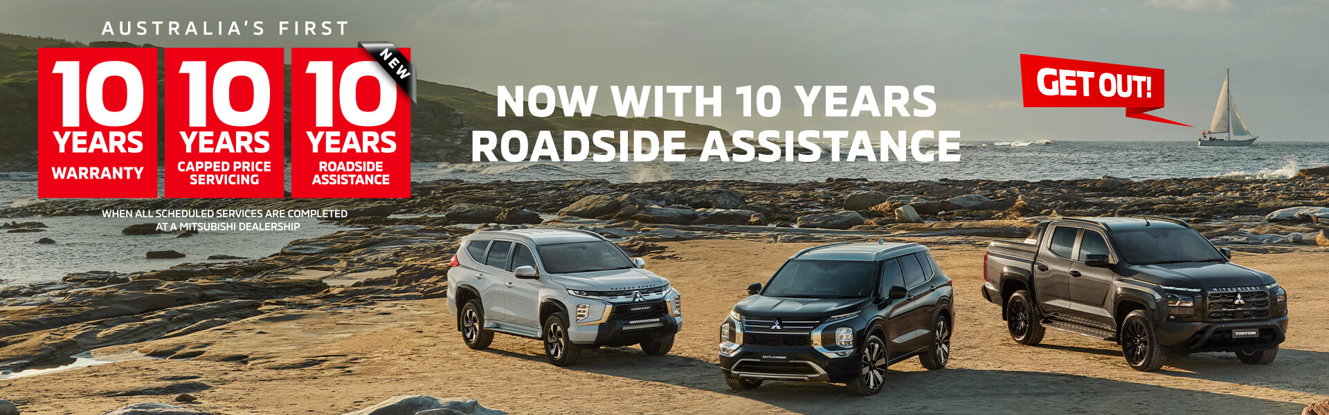 ⋄3 Up to 10 years Roadside Assistance, comprised of an initial 12-month period extended for further periods of 12 months upon completion of each eligible Capped Price Service (up to a maximum of 10 annual Roadside Assistance periods in total). Eligibility conditions and exclusions apply, full terms and conditions can be found here: https://www.mitsubishi-motors.com.au/owners/diamond-advantage/roadside-assist.html